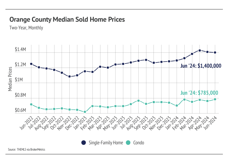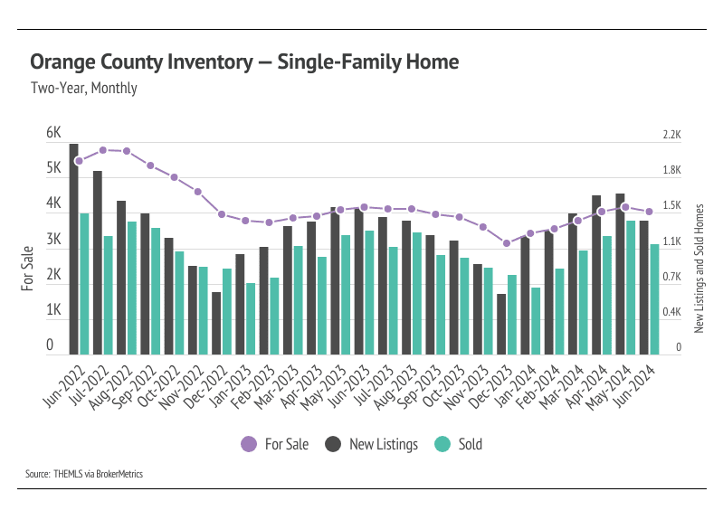 In the beginning of 2024, we were hopeful that inventory and new listings would resemble historical seasonal patterns. However, new listings haven’t come to the market in the quantity needed to bring a significant increase in inventory. The number of new listings coming to market is a significant predictor of sales, and buyers simply aren’t able to buy homes that aren’t for sale. The demand in Orange County is there, but supply — especially new supply — hasn’t come to the market. Now that we’re halfway through the year, it’s clear that supply will remain tight until spring 2025 at the earliest.
