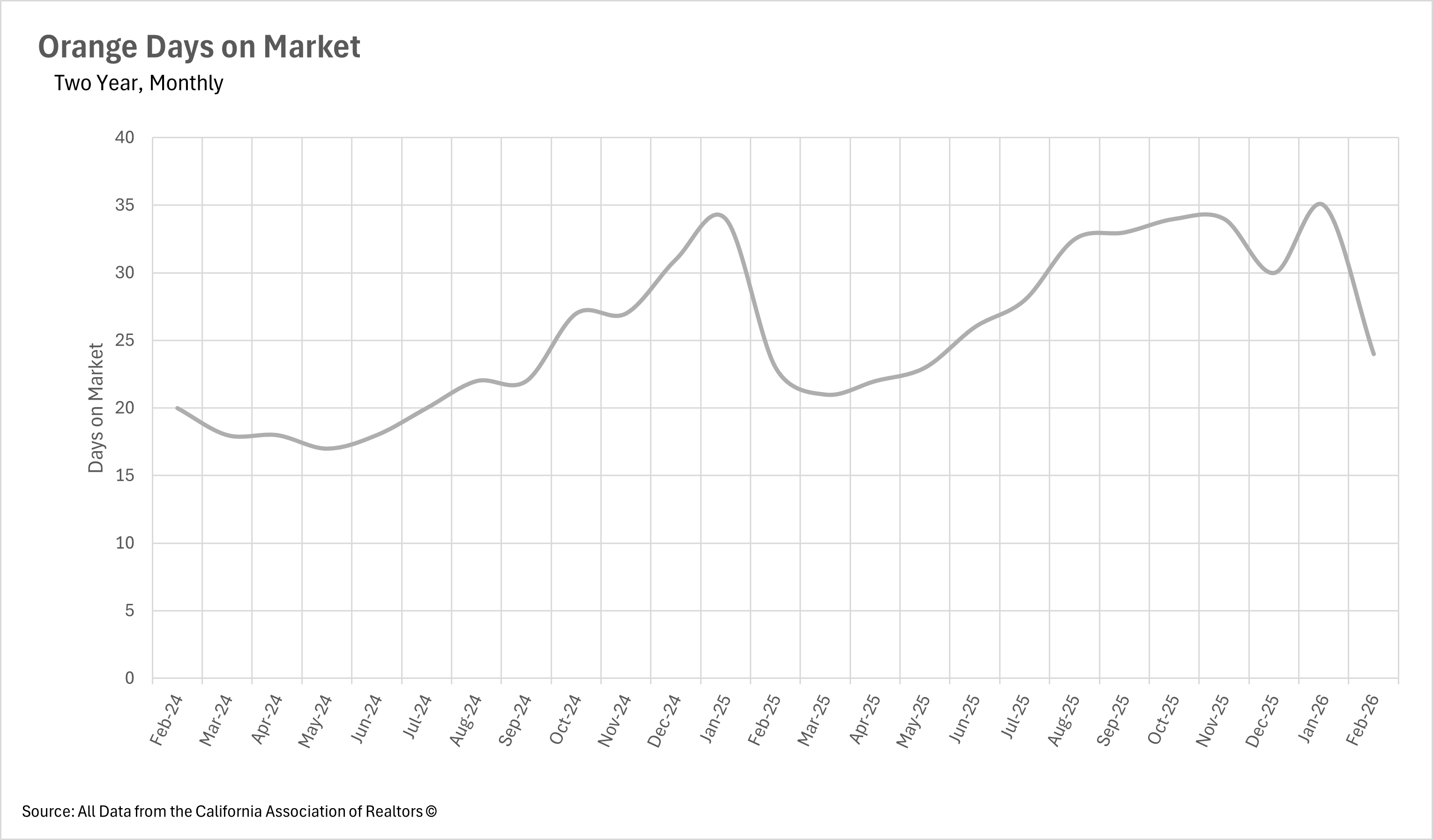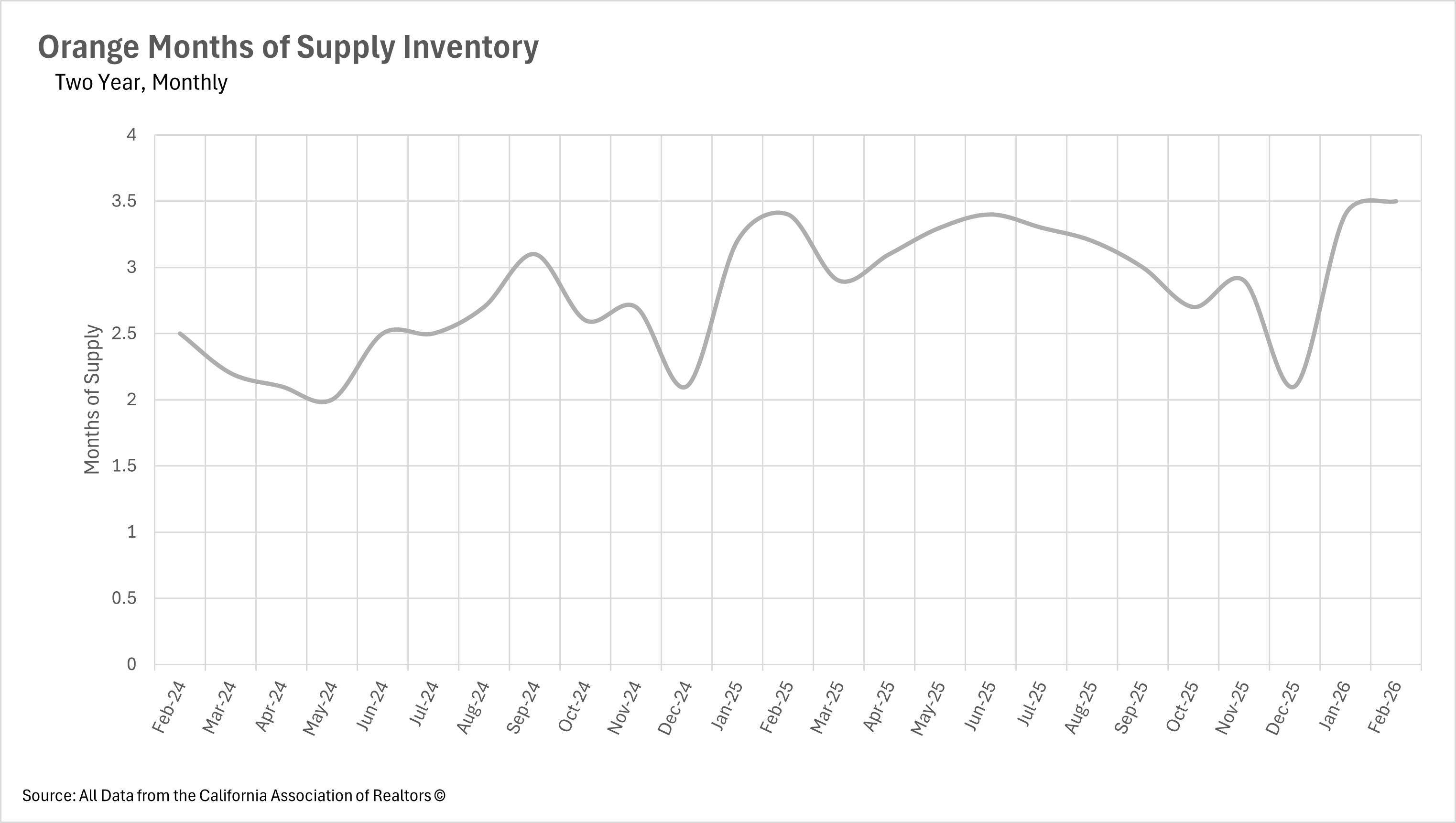 As of February, Orange County has 3.5 months of supply on the market, representing a 2.94% increase on both a month-over-month and year-over-year basis. This puts Orange County firmly in balanced market territory, leaning slightly toward being a buyers' market. After spending most of the back half of 2025 as a seller's market, the area has now seen two consecutive months of MSI above the three-month threshold to start 2026. With inventory continuing to build and the spring buying season just around the corner, it will be well worth watching whether Orange County remains balanced or if the influx of buyers is able to pull it back toward a seller's market.