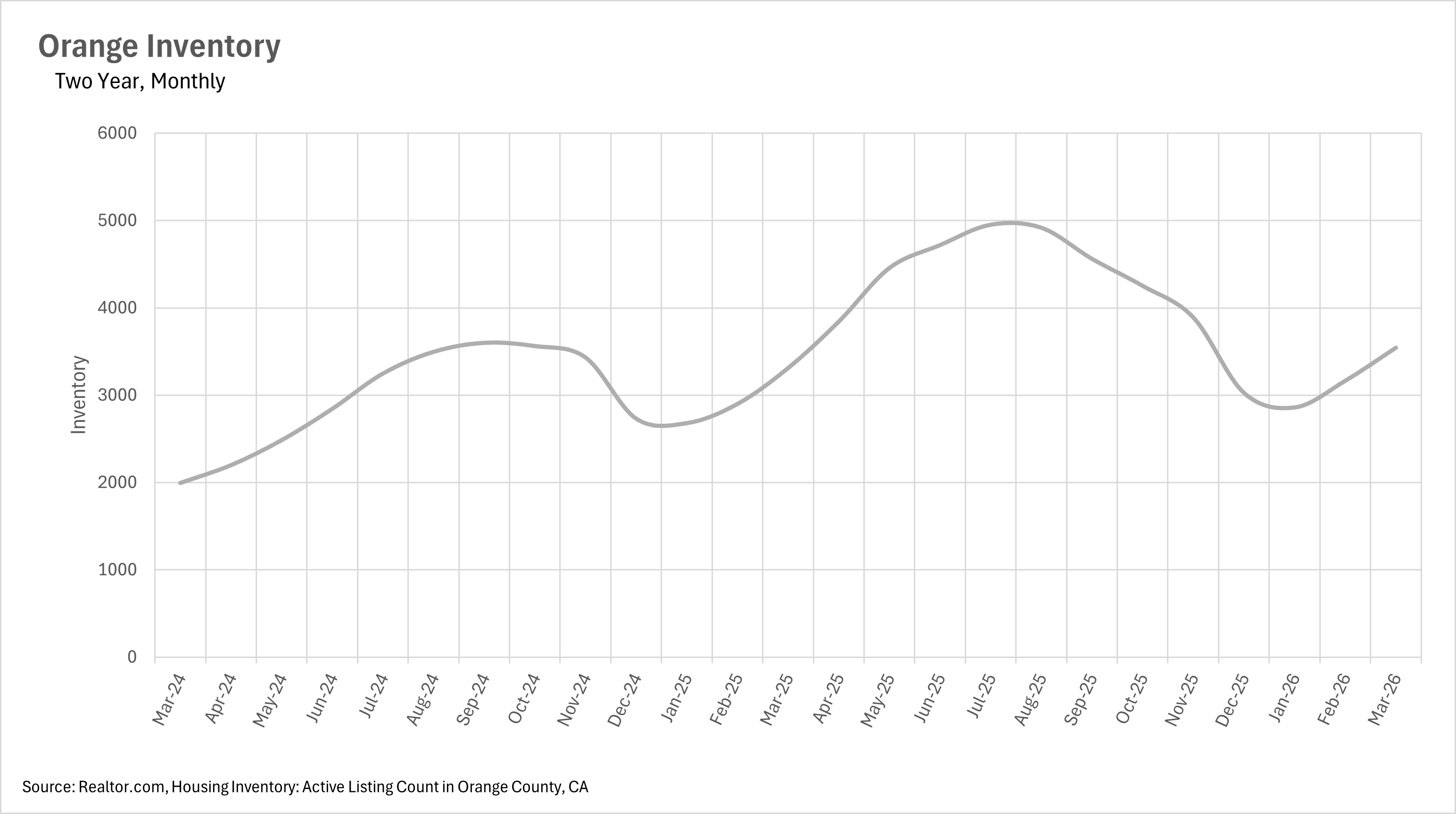 As we move past the seasonal lows of the winter, inventory in Orange County continues its steady climb back up. In the month of March, there were 3,544 active single-family home listings on the market, representing a 7.00% increase on a year-over-year basis and an 11.94% increase on a month-over-month basis. This is now the second consecutive month of double-digit month-over-month inventory growth, following February's 10.70% jump. While this pace of growth is typical for this time of year, as more sellers prepare to list heading into the busy spring season, the year-over-year increases signal that buyers will continue to enjoy a wider selection of listings than they had a year ago. That said, we're still well below the summer 2025 peaks, when inventory topped out at nearly 5,000 listings.