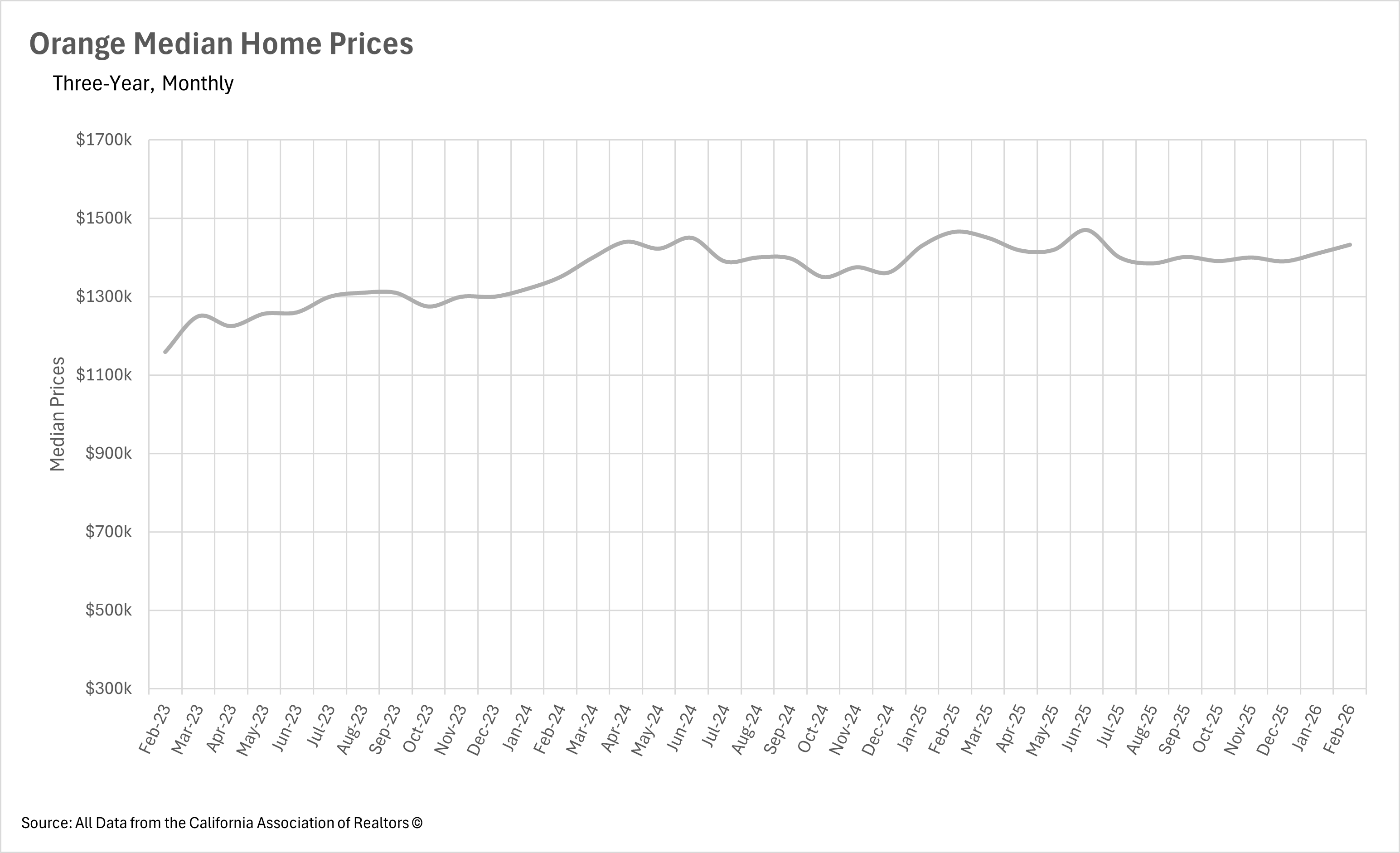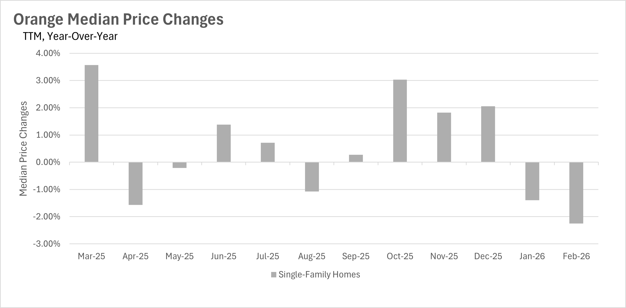 After kicking off 2026 with a slight year-over-year decline in January, Orange County extended that trend into February, with median sale prices dropping by 2.25% on a year-over-year basis. The median single-family home sold for $1,432,500 in February, down from $1,465,500 during the same month last year. It's worth noting that the early months of 2025 were exceptionally strong for Orange County, with February 2025 representing the highest median sale price of the entire year, so the comparables Orange County is up against right now are genuinely tough to beat. With inventory continuing to build throughout the area, it wouldn't be surprising to see this softness in pricing persist for a bit longer before the spring and summer buying season heats up.