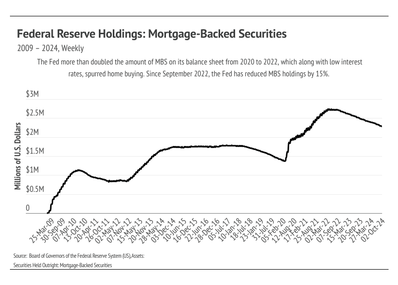 During the early pandemic, the Fed provided huge incentives to buy homes as part of its easy monetary policy by purchasing Mortgage-Backed Securities (MBS) and dropping interest rates. MBS play an integral role in home financing by allowing banks to bundle and sell mortgage loans, turning the bank into an intermediary between the financier and financial markets (investors). Banks get some fees, while investors (rather than the bank) get the interest and incur the risk from the bundle of mortgages. So, in many ways, the bank facilitates the loan but investors are the ones really lending the buyer the money. The Fed was a huge investor in 2020 and 2021, doubling its MBS holdings to $2.7 trillion by 2022. However, the Fed isn’t buying any more MBS and, in fact, has sold 15% ($4.16B) of its MBS holdings over the past two years. Even though rates are coming down, the MBS market has shifted to make loans less easy to originate, which has contributed to the market slowdown.