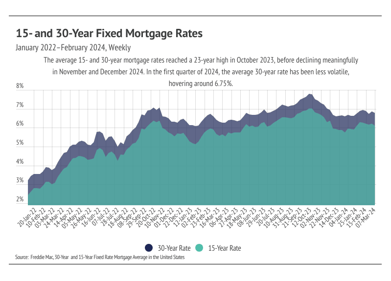 Mortgage rates fell slightly in March, closing the month at 6.79%. The Fed continued its wait-and-see approach to rate cuts during the March meeting, holding the federal funds rate steady and stating that they need more data indicating that the economy is continuing to improve.