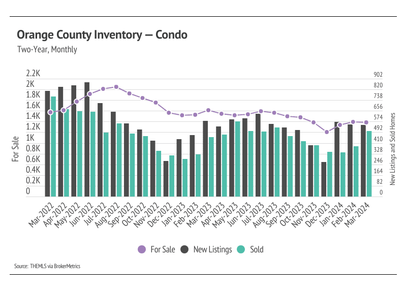 Single-family home and condo inventory and new listings declined slightly from February to March 2024, while sales increased. Inventory has trended lower from August 2022 to the present, as far fewer listings have come to the market. Low inventory and new listings, coupled with high mortgage rates, led to a substantial drop in sales and a generally slower housing market. Typically, inventory begins to increase in January or February, peaking in July or August before declining once again from the summer months to the winter. In 2023, inventory patterns didn’t resemble the typical seasonal inventory wave. We were hopeful that inventory and new listings would increase after new listings rose 101% month over month in January 2024. However, new listings have held steady. The number of new listings coming to market is a significant predictor of sales, and the substantial increase in new listings in January led to a 23% increase in sales in February. Demand in Orange County is far greater than supply; in March, new listings only rose 1%, but sales still increased 24%. The next three months will be critical to our understanding of the market. More supply will mean a healthier market. Year over year, inventory is down 13%, but sales are the same as in March 2023.