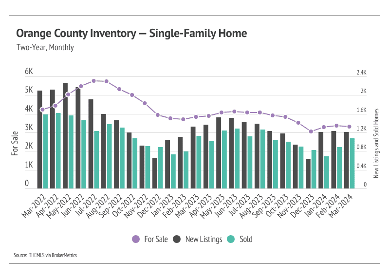 Active listings in Orange County declined 0.4% month over month, as sales outpaced new listings. From February to March, sales rose 24.3%, while new listings increased 0.7%. Housing supply is still near record lows.