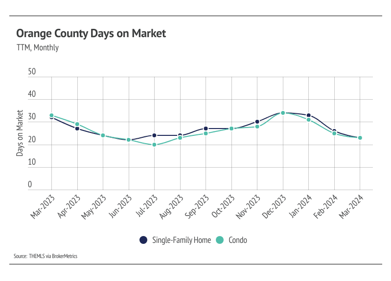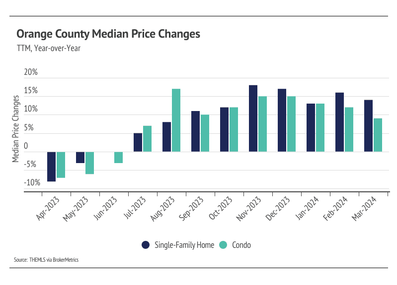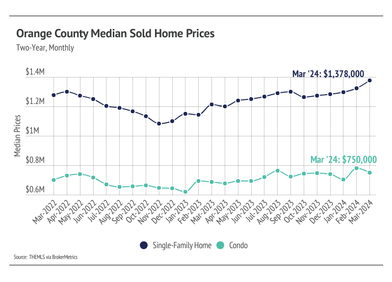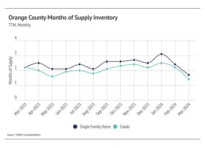 In Orange County, low inventory and high demand have more than offset the downward price pressure from higher mortgage rates. Prices in Southern California generally haven’t experienced larger drops due to higher mortgage rates. In March, the median single-family home price reached $1,378,000 — a new record high. Prices typically peak in the summer months, indicating single-family home prices will likely rise to a new high in almost every month during the first half of the year. Condo prices declined month over month from the all-time high reached in February 2024, but will almost certainly reach new highs in Q2 2024. Additionally, inventory is so low that rising supply will only increase prices as buyers are better able to find the best match.