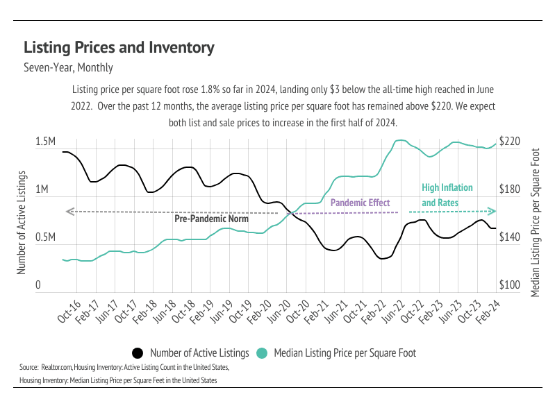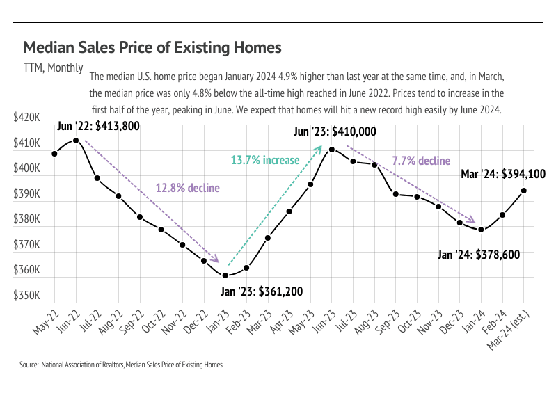 The median single-family home price reached an all-time high in March 2024. Month over month, prices rose 4.0% for single-family homes but fell 0.8% for condos. We expect new highs for single-family homes throughout the first half of 2024. Condo prices declined 3.8% from the high reached last month.