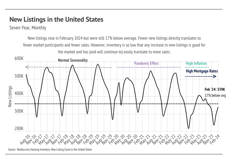 High mortgage rates soften both supply and demand, but at this point rates have been above 6% for 16 months, and rate cuts will likely occur sometime this year. Potential buyers have had longer to save for a down payment and will have the opportunity to refinance in the next 12-24 months, which makes current rates less of a limiting factor. However, high demand can only do so much for the market if there isn’t supply to meet it.