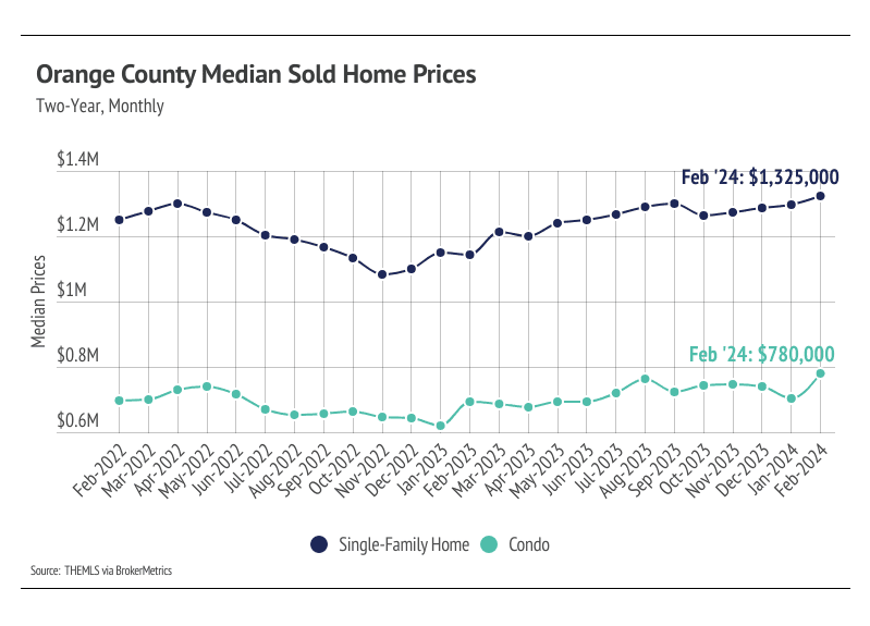 In Orange County, low inventory and high demand have more than offset the downward price pressure from higher mortgage rates. Prices in Southern California generally haven’t experienced large drops due to higher mortgage rates. In February, the median single-family home and condo prices reached all-time highs of $1,325,000 and $780,000, respectively. Prices almost never peak in the winter months, indicating home prices will likely rise to a new high in almost every month in the first half of the year, at least for single-family homes. Additionally, inventory is so low that rising supply will only increase prices as buyers are better able to find the best match.