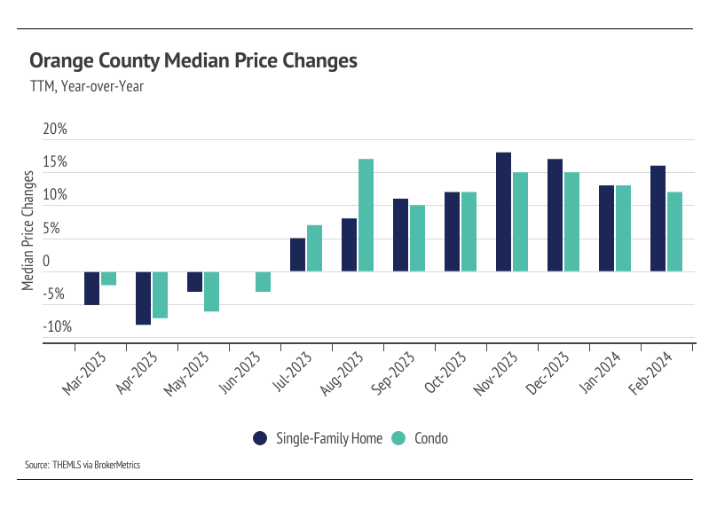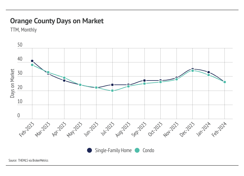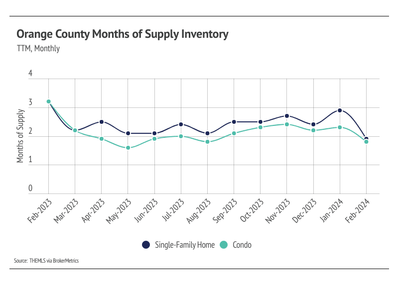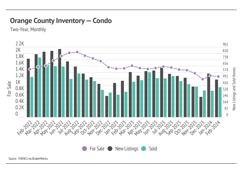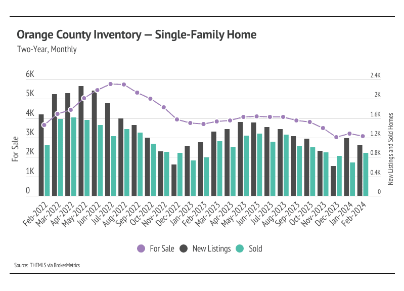 Active listings in Orange County declined 2.5% month over month, as new listings fell and sales increased from January to February 2024. Housing supply is once again near record lows.