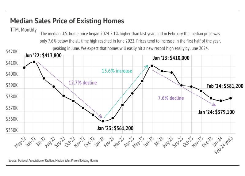 Median single-family home and condo prices reached all-time highs in February 2024. Month over month, prices rose 2.1% for single-family homes and 11.0% for condos. We expect new highs for single-family homes throughout the first half of 2024.
