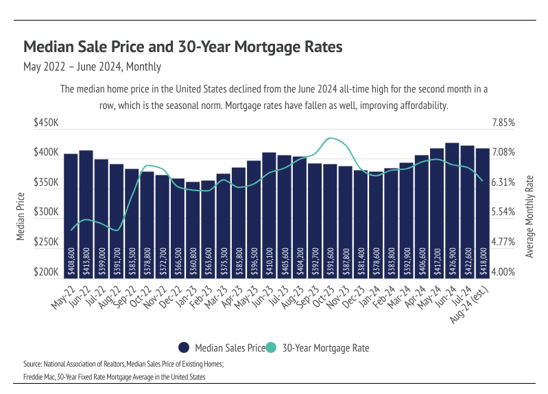 Nationally, the monthly cost of financing a median-priced home was 8.3% lower in August 2024 than in June because the median home price declined 2.1% over the past two months, and mortgage rates have dropped.