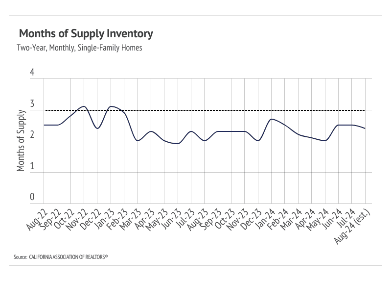 Months of Supply Inventory fell slightly in August 2024 and continued to indicate a sellers’ market