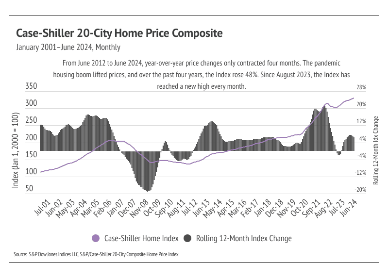 The median single-family home price declined over the past two months after reaching an all-time high in June 2024. We expect price contractions in the second half of the year, which is the seasonal norm. Prices will likely decline modestly for the rest of the year.